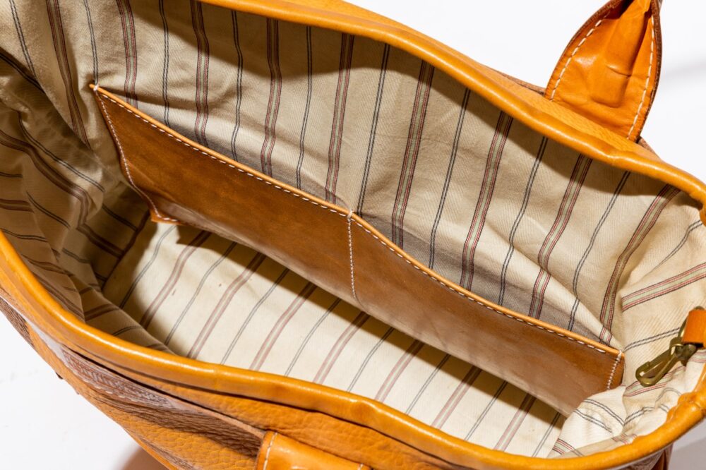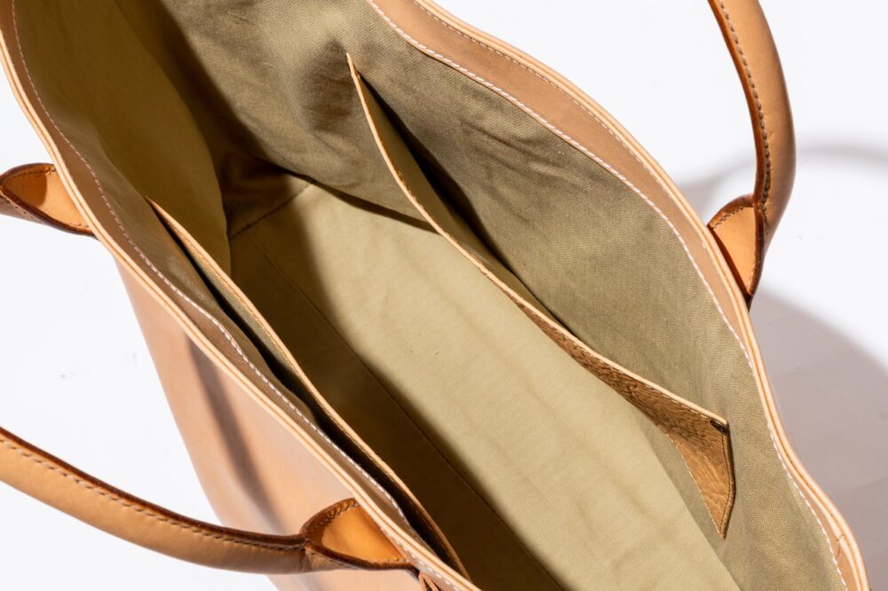 横型レザーポーチとトートバッグをハイブリッドさせたようなデザインの縦型トートバッグ。ライニングにはヘリンボーンの生地を採用している。7万5900円