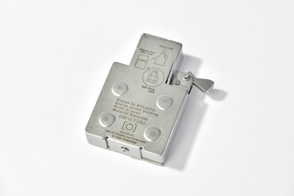 タブドックはサージカルメタルで作られている。インサイドユニットと互換サイズなので普通サイズのジッポーであれば使えるはず。