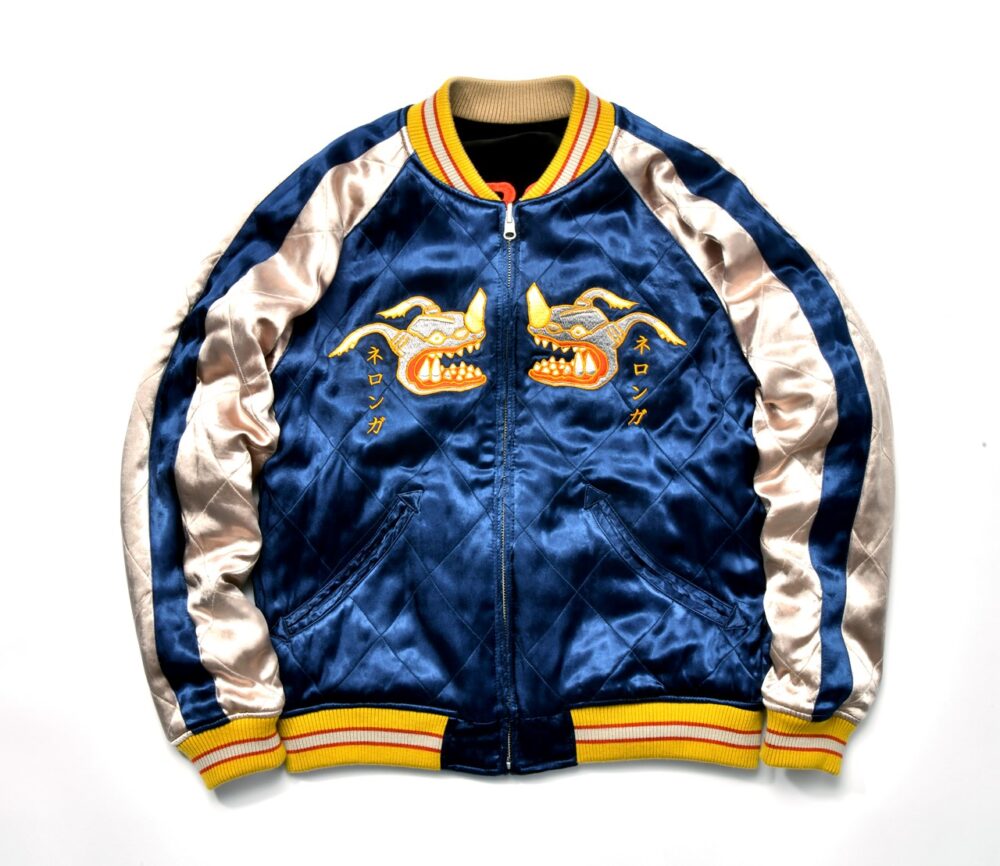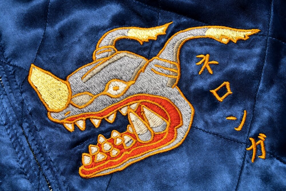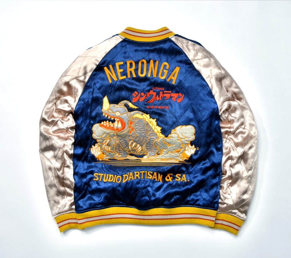 虎でも龍でも鷹でもなく、胸に刺繍されるのは禍威獣ネロンガの顔。「ネロンガ」のカタカナがヴィンテージスカジャン風で思わずニヤリ。
