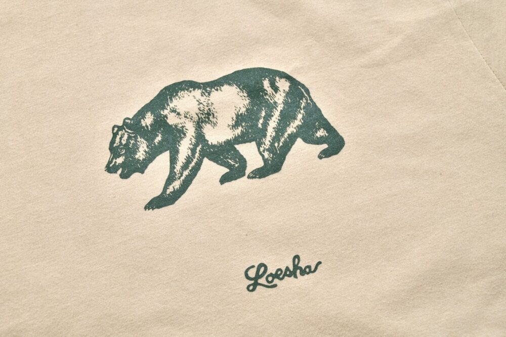 もとにしたヴィンテージは、’90年代後半くらいの長袖Tシャツ。まだ暑いので、とりあえず半袖でのリリースだけど、秋には長袖も出るかもね。このビジュアルを見て「ん!?」と違和感を覚えた人は鋭い、というか、かなりのフリー通! 実は、彼は左胸の熊のタトゥーを昨年入れたばかりなんです。