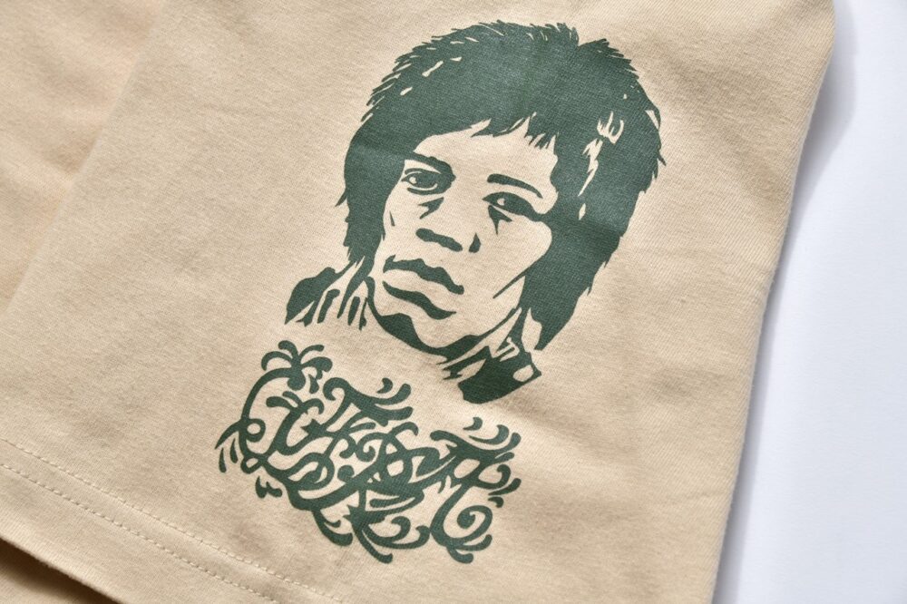 だからこの熊プリントは、『フリーウェイ』のショップロゴでも使っているカリフォルニアの熊さん。現在のフリーのタトゥーにならって、ネームラベル替わりに左胸にプリントしたんだって。このアイデアは、かなりおシャレ! だからフリー本人の熊タトゥーとは、アングルが同じだけで表情は全く異なるのです。ちなみに左上腕のジミヘンの顔は、ヴィンテージTシャツのプリントが似ていないということで、今回の復刻に際して精度を高めたそう。