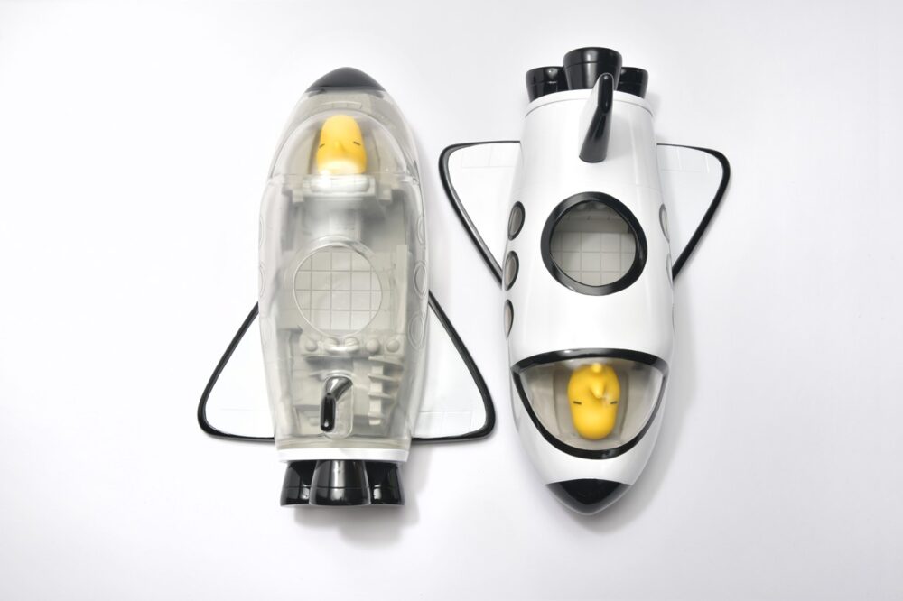 アストロノーツの現代版といえるプロダクツは、SECRETBASEのオーナーであるHIDDY氏が独自にアレンジした逸品。オリジナルフルカラー版とクリア版(X-RAYスタイル)の2種類を展開。組み立てた状態で約W280㎜×H230㎜×D190㎜。シャトルの台座は各モデルに一つ付属。周りを囲むようにSECRETBASEのロゴがデザインされる。台座サイズはφ96㎜×H51㎜。各3万3000円