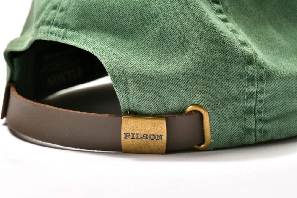 サイズ調整用のアジャスターはフィルソンらしい油分のある革を使用。味わいのある真鍮製のバックルも装備している。