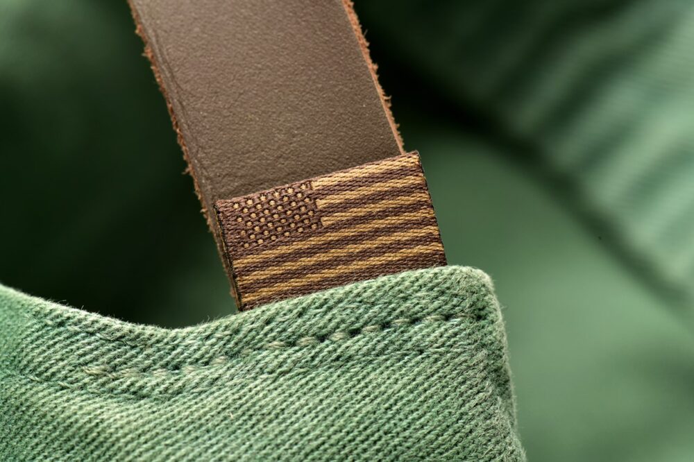 アメリカ製なのにいつもの派手な星条旗のラベルは付かず。でもよく見ると革と同系色の星条旗ラベルがしっかり付属している!