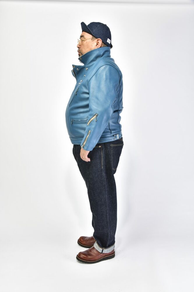 生地はピュアブルージャパンオリジナルの14オンスセルビッジデニム。太い腿回りから裾にかけてテーパードする独特のシルエット。股上は深め。腰回りはバルーンシルエットにはならないので、実際よりもすっきり見える視覚効果が得られる。サイズはS,M,Lの3サイズ。股下は32インチで統一。ワンウォッシュでの納品となります。価格はすべて2万9700円