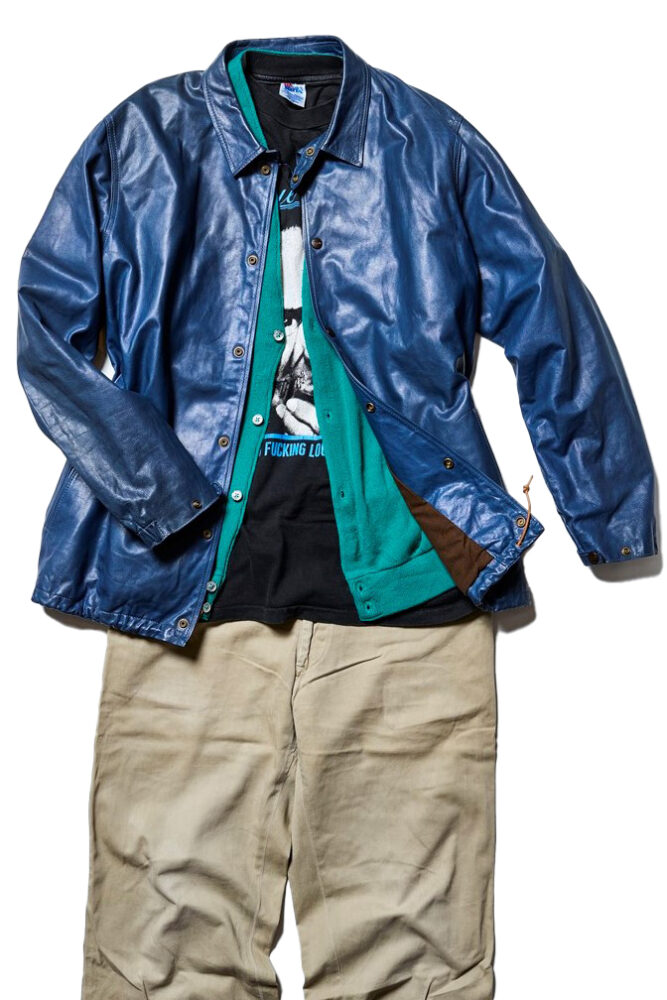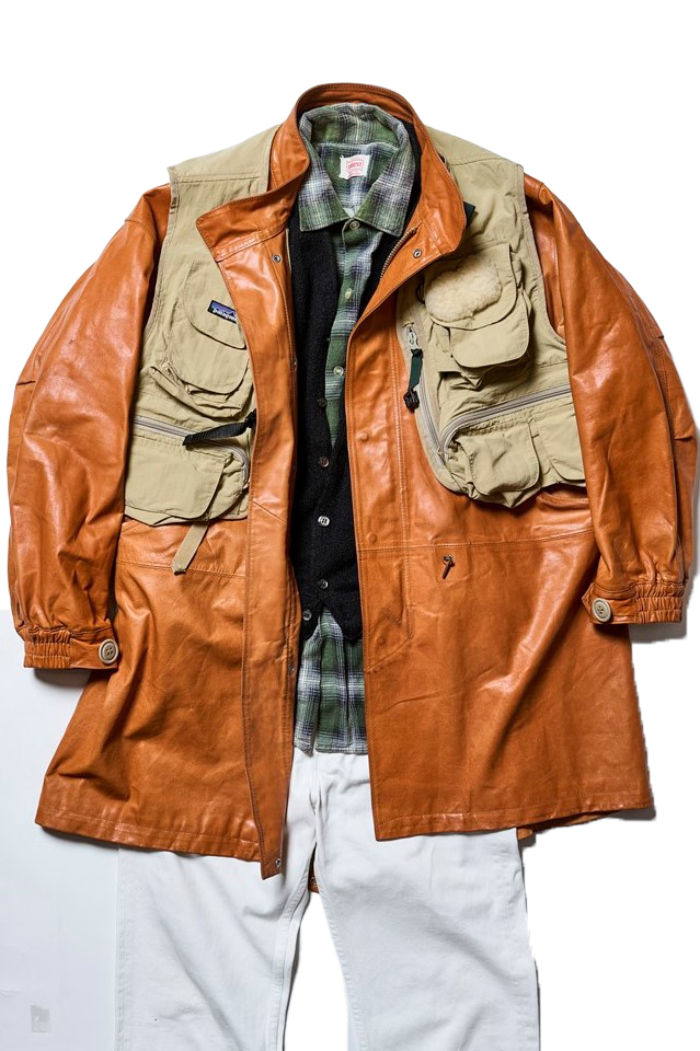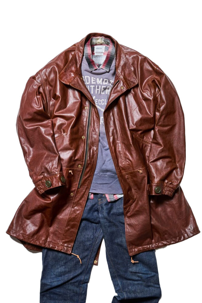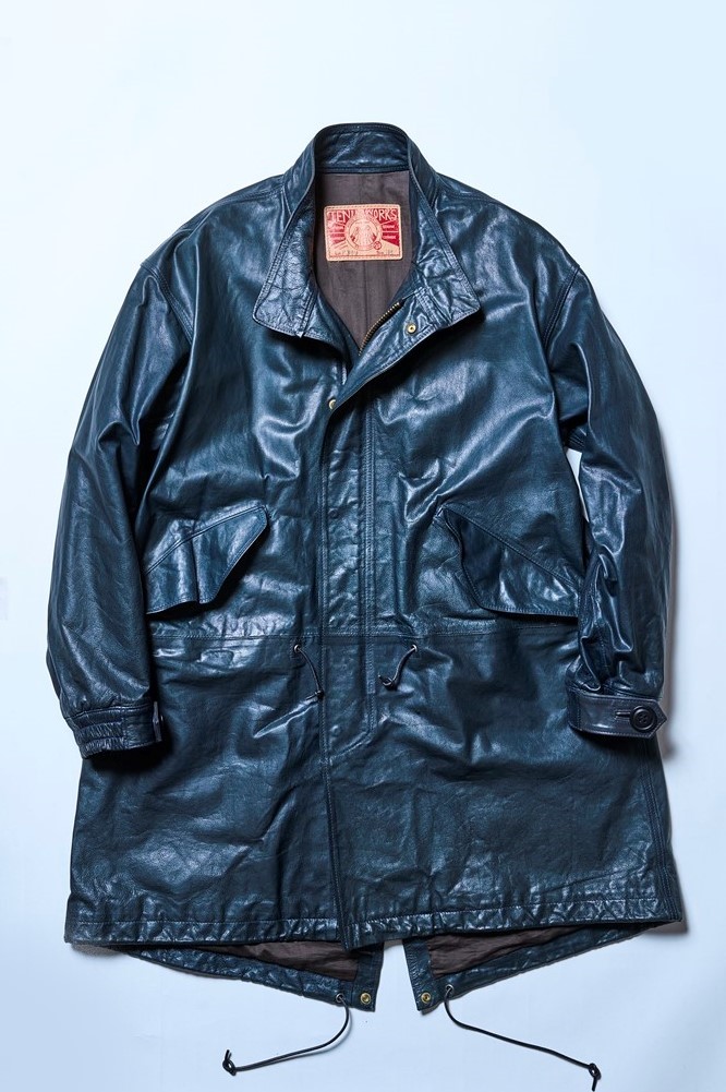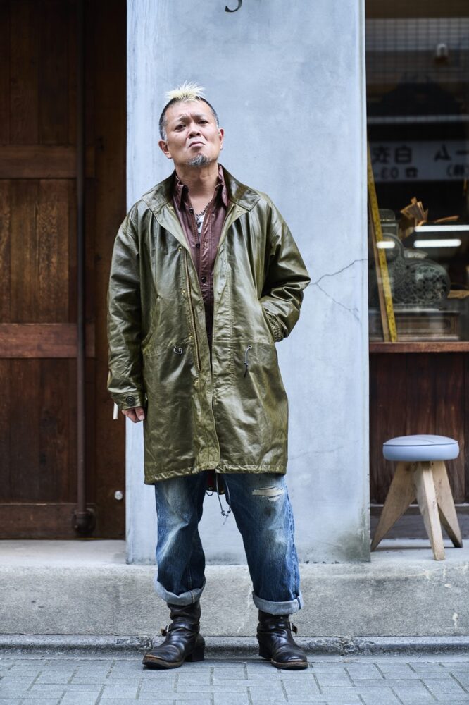 私モヒカン小川、このフィッシュテールコートを初めて見た時には衝撃が走ったね。レザーでここまで再現できるなんて、正直びっくりした。実際、オリジナルのMー65パーカを持っていて、冬にはライダースの上から羽織ったりしているんだけど、もしかしたらコイツも革ジャンの上から羽織れるんじゃね? と思い、オリーブのFJ02を即オーダー。数か月後、手元に届いて袖を通して、その着用感の軽さにまたびっくり。