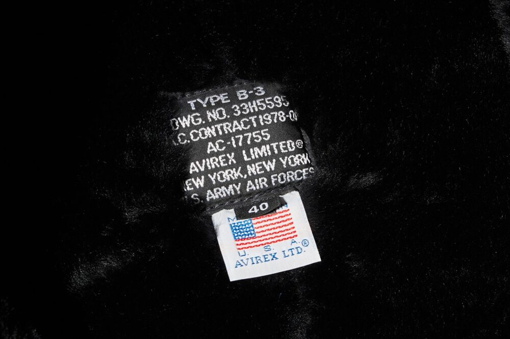 AVIREX代表するアイテム、B-3。ブラックバージョンはシックで上品な印象。ブランドタグとは別に、MADE IN U.S.A.のタグが付けられた本国生産にこだわった特別なモデル。ブラウンカラーも健在。22万円