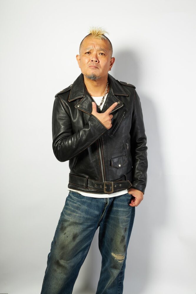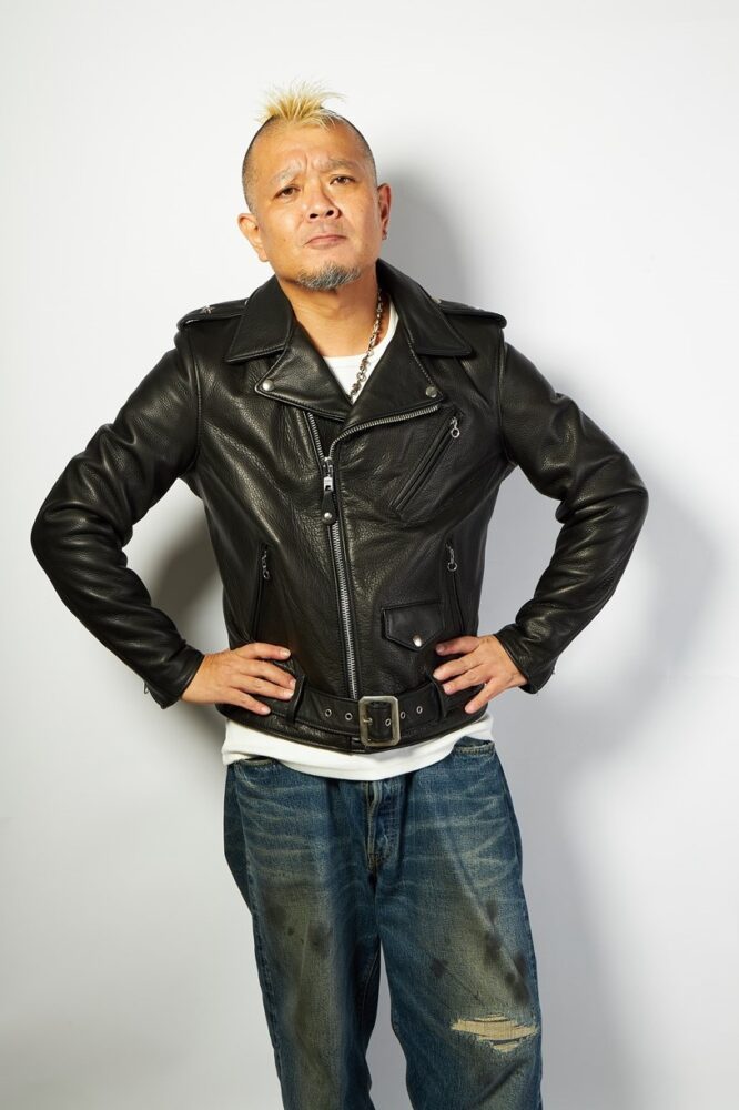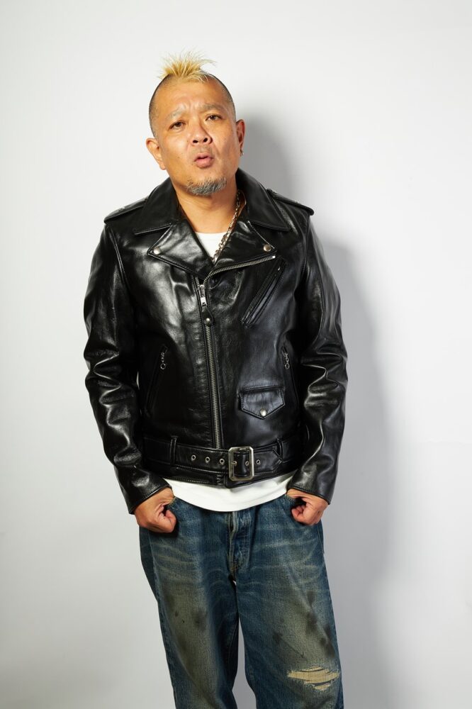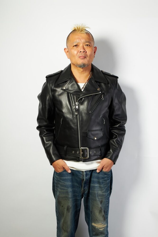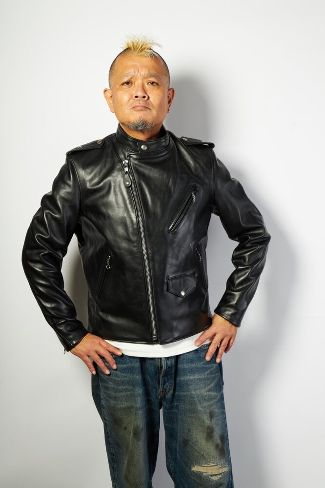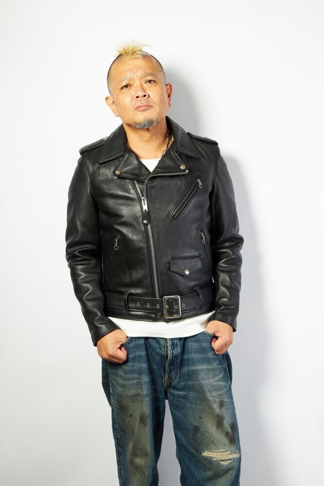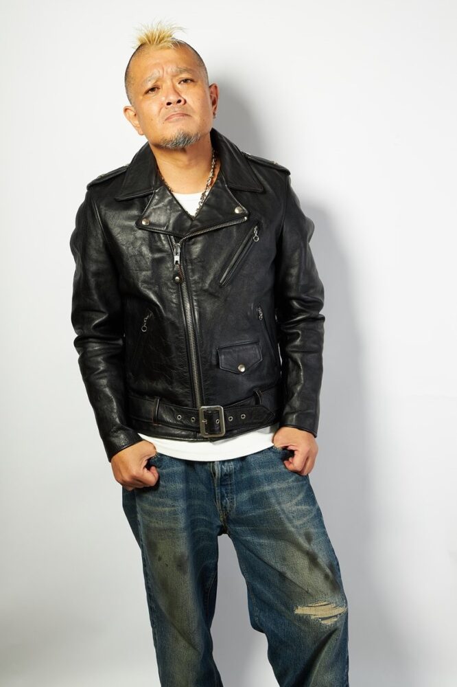 「この613USがワンスターの基本形。着丈は短めでアームホールも太めだが、王道のライダース然としたスタイルが楽しめるぞ。ちなみに身長175㎝体重72㎏の俺が着ているサイズが40。ちょっと大きめなので、俺には38がジャストかな」