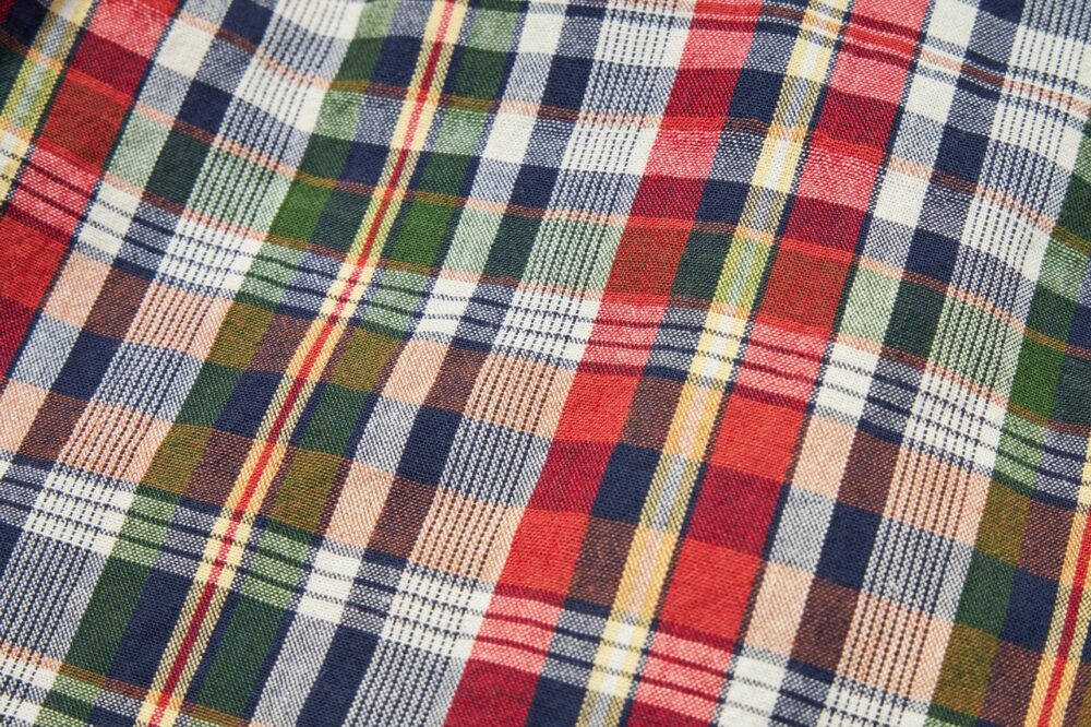 凹凸感のあるインド製マドラス生地はドライな着用感が心地よく、トラッドマインドに十分に配慮した配色。デニムにチノパンに軍パンにと、コーデの幅が広い万能カラー。