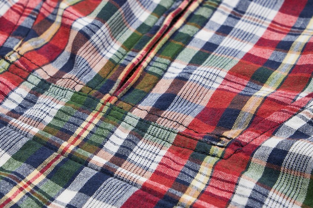 フロント中央のポケット部分や背面のショルダーヨークの切り替え部分など緻密に計算されたパターンで複雑なチェックの柄合わせを行う徹底ぶり。