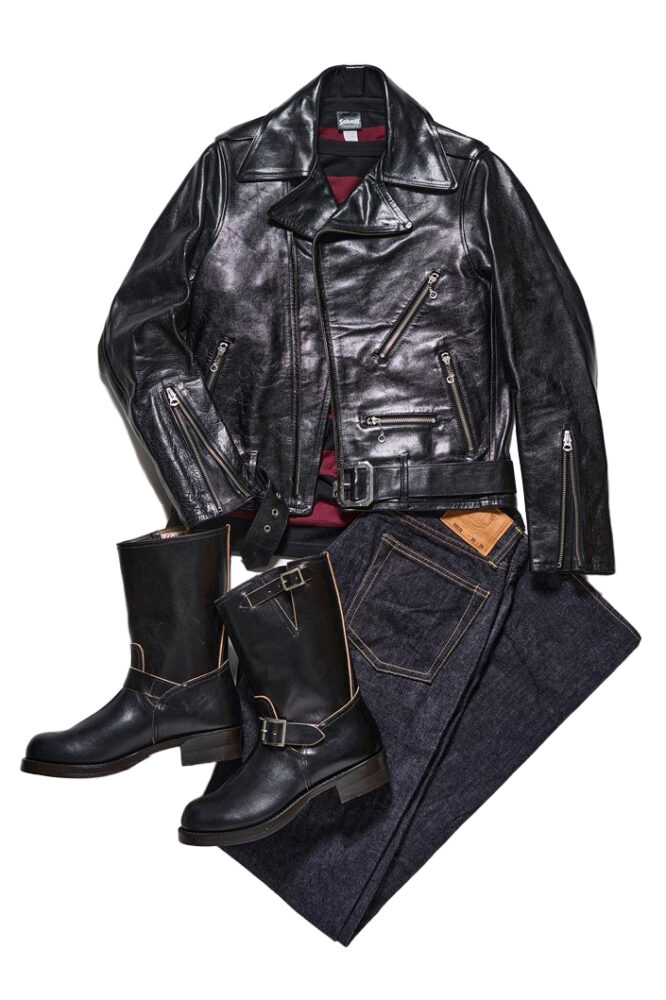 リジッドデニム&エンジニアブーツで下半身をまとめた、男らしくダブルライダースを着るための正統派コーディネイト。そんなラギッドスタイルを和らげるため、インナーにはボーダーTシャツを仕込んで遊び心もプラス。とはいえ色使いは、あくまで暗めが無難。