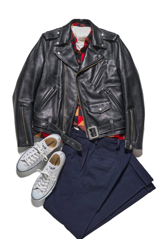 ベースレイヤーのサーマルとインナーの柄シャツで、軽やかなカジュアル感を演出。下半身はウールスラックス+オールスターで、’70sテイストを意識したクラシックスタイルに。ホワイト、レッド、ネイビーの積極的な色使いが、シボ感のあるレザー特有の重厚感を緩和する。