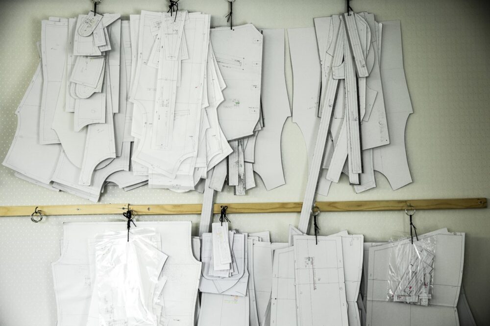 壁には型紙がずらりと並ぶ。レザージャケットの本格生産をきっかけに定番ジャケットのパターンも見直しさらなる品質向上も図った。
