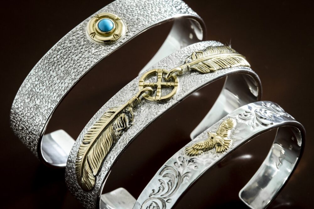 ハンドメイドで製作されたスペシャルなバングルは、シルバーと18金ゴールドのコンビネーションが際立っている。すべて自身のルーツとなるネイティブアメリカンへのオマージュ的なアートワを施している。上から8万1400円、22万円、8万8000円