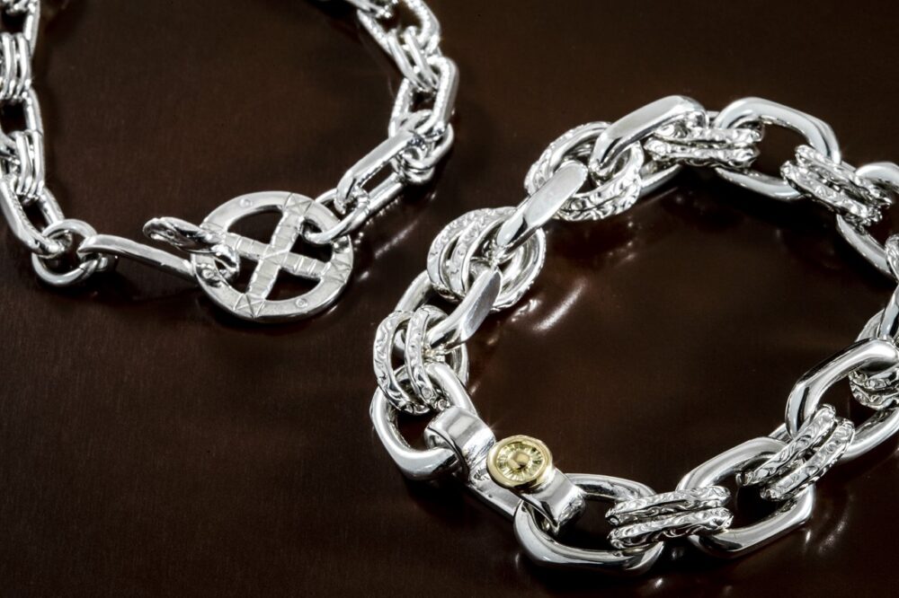 本池秀夫氏と同郷であり、日本を代表する写真家であった植田正治さんからオーダーされたチェーンブレスレットを再構築。太いチェーンには、繊細な唐草模様がハンドメイドで施されているのが大きな特徴である。右/6万2640円、左/11万3400円