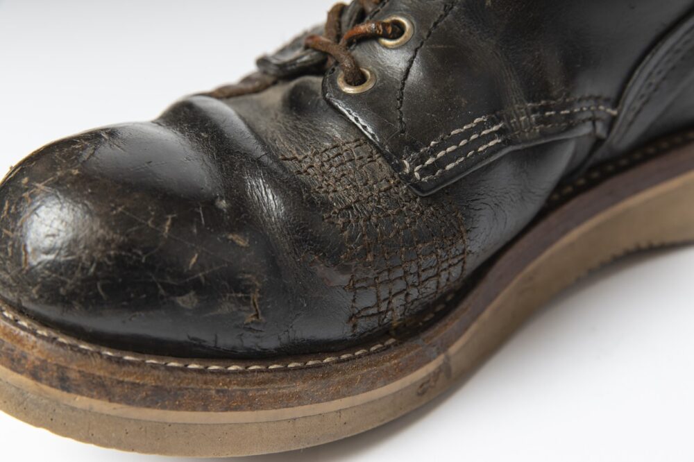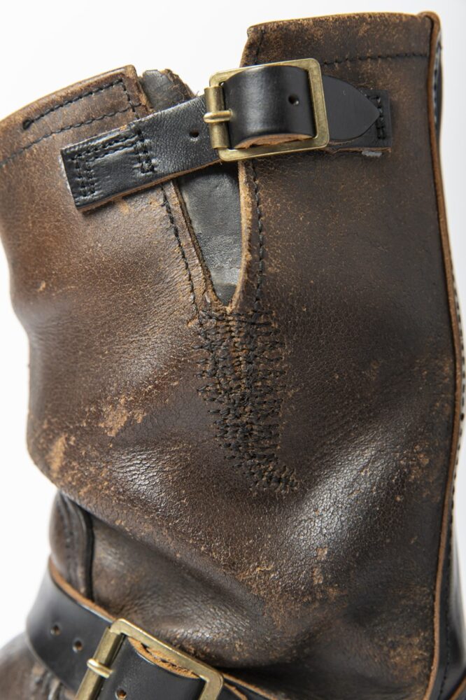 例えばダメージを負ってしまったレザーです。デニムやシャンブレーなどの布帛と違って、レザーは破れてしまうと修正することができません。長年の使用でレザーが乾燥し、そこにダメージが加わることで痛んでしまうケースもあります。そういった場合は、リペアするのではなく、ワークジャケットを直すように、別のレザーを当てたり、ステッチで叩いてリメイクすることをお勧めしています。ワークブーツなら違和感もなく、独特の表情になるのも魅力です」