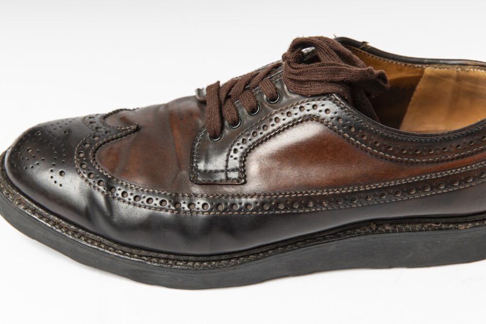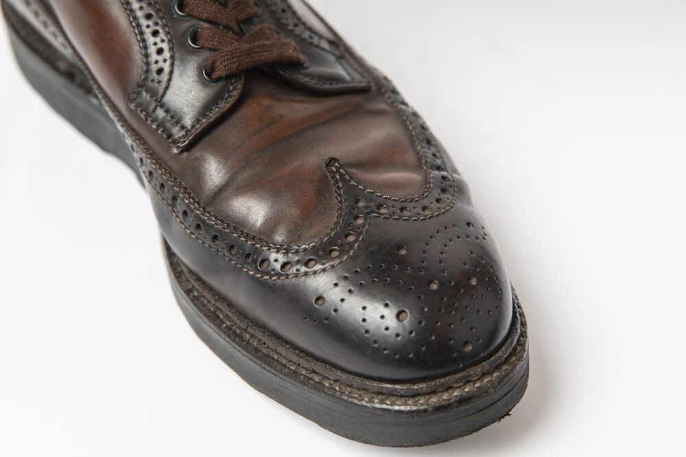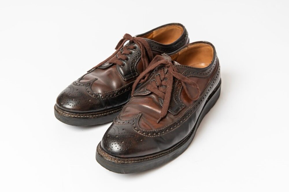 これはオールデンのウィングチップシューズで、ホーウィン社のコードバンを使っている。その革の特性上、シミができていたが、色を抜いて染め替えており、これがいい風合いになっている。ツートーンが斬新さも引き立てる。1万6500円