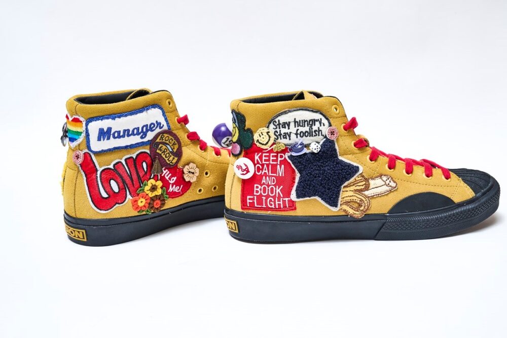 ヴィンテージのワッペンを使用した、まるでカートゥーンのようなポップで賑やかなハイカットスニーカー。見ているだけでピースフルな気持ちになる。ベースで使用したスニーカーはVISION STREET WEAR のSUEDE HI YELLOW。27.0cm。2万9700円