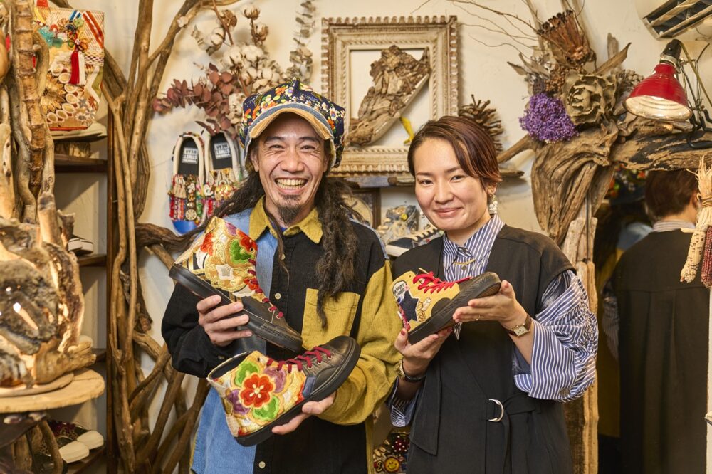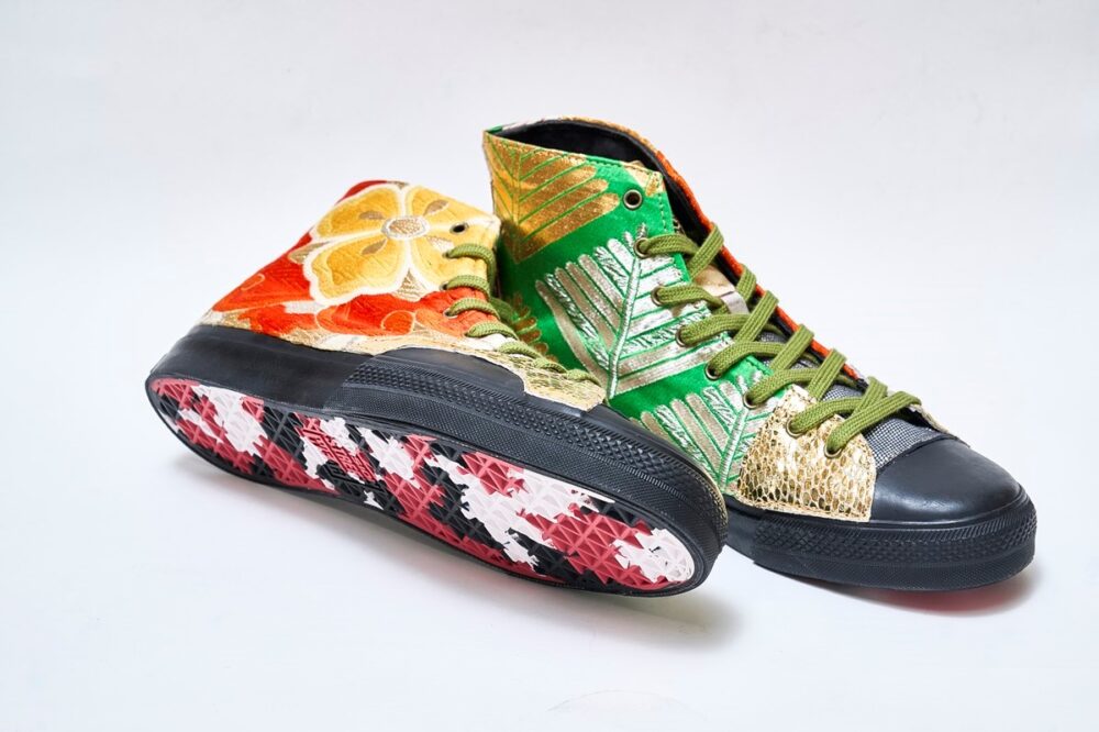 使用した生地は着物の帯。複数の帯を丁寧に合わせて仕上げた職人技が光る一足。ベーススニーカーはVISION STREET WEARのCANVAS HI。28.0㎝。3万3000円