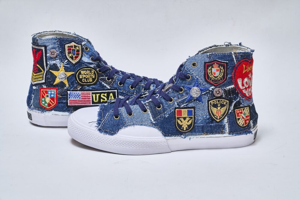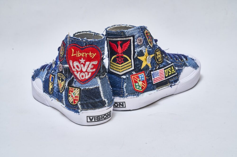 濃淡の異なるデニム生地をパッチワークであしらい、アメリカの警察などの法執行機関のワッペンを合わせている。でも左足の踵には『LOVE YOU』の愛らしい文字が! ベーススニーカーはVISION STREET WEAR のCANVAS GATOR。27.0㎝。3万3000円