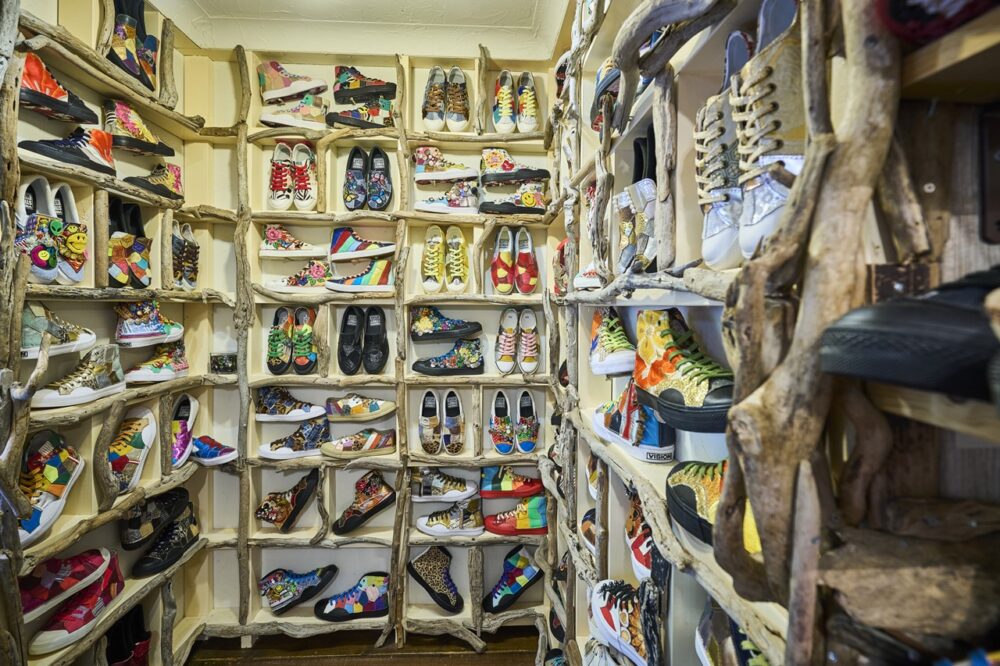 店内にはハンドメイドで作られたリメイクスニーカーが所狭しと展示されており、どれも個性的&カラフルで圧倒されてしまう。そして、それらは基本的にどれも一点モノ。つまり、どのスニーカーも一期一会の出会いなのである。ちなみに今まで製作した数は4000足を超えるとのこと。