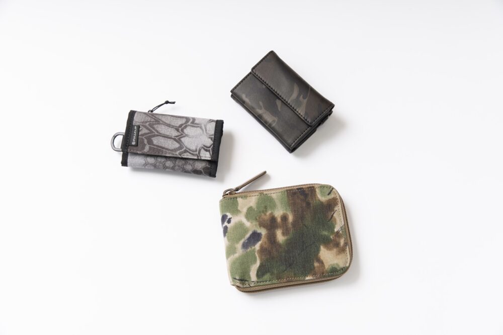 キャッシュレス時代に合わせた小型のウォレットが充実。すべてミルスペックの生地。上/ツーアングル8745円、中/コンパクトスクリーン3740円、下/マイティウォーリア1万5950円