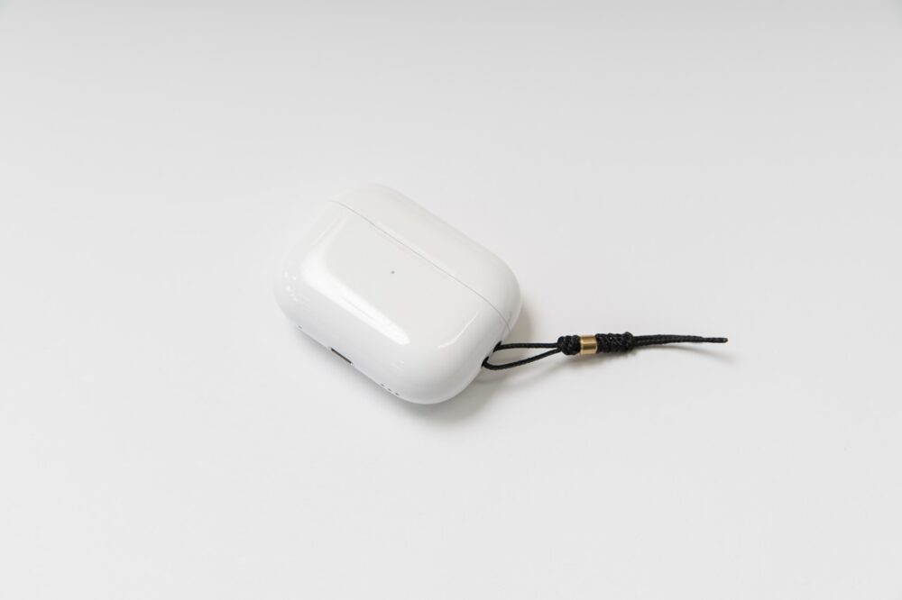 取材時に訪れた際にワンオフで作ってくれたリメイクのストラップ。上記のマイクロコードを編んで、削り出しの真鍮ビーズを組み合わせている。