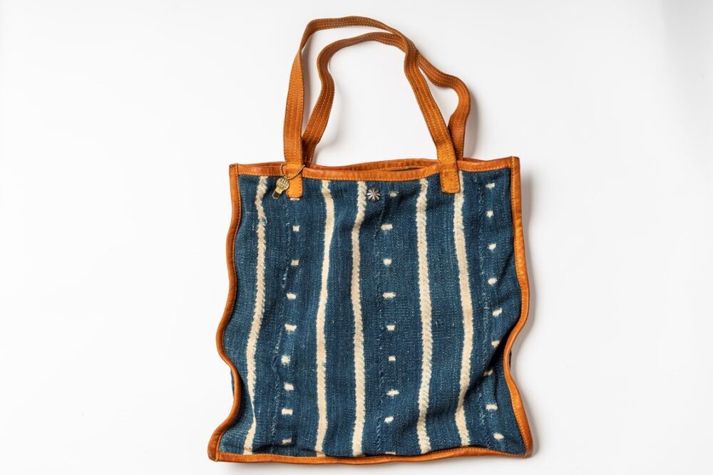 アフリカの伝統的なインディゴ染めのファブリックを使ったHAND LIGHTのトートバッグ。レザーを組み合わせることで、耐久性をアップ。まったく同じ表情やパターンのないファブリックなので、一つとして同じ物が存在しないのもたまらないポイントだ。3万800円