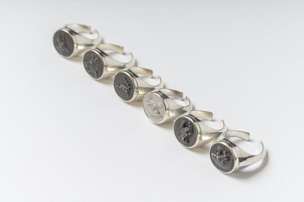 様々な動物がモチーフとなったハンティングジャケットのボタンを使ったリング。サイズバリエーションも豊富なので、ユニセックスで着用することができるのもおもしろいところ。価格未定