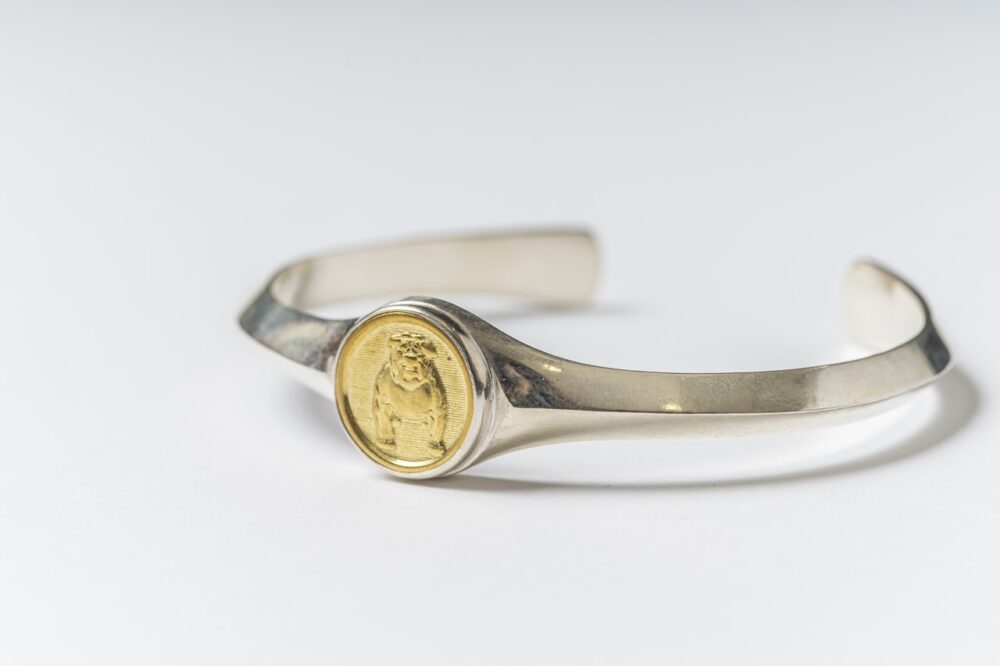 ヴィンテージのボタンをアレンジしたボタンワークスのオリジナルバングル。光沢感のあるシルバー925を使っている。ボタンは真鍮製で際立っている。価格未定