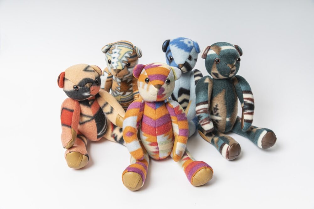 なんともかわいらしいテディベアは、ヴィンテージのビーコンブランケットを解体したもので、HAND LIGHTとロッキーマウンテンフェザーベッドのコラボレーション。腕と足が稼働する本格的な作りになっており、バリエーションも豊富。各1万780円