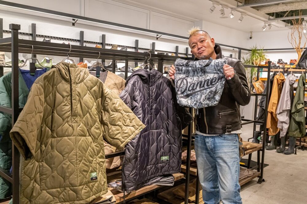 中綿キルティングのオーバーコートや、オリジナルデザインのカモフラージュ柄バッグなど、ダナーが展開するアパレルはクオリティも高い。