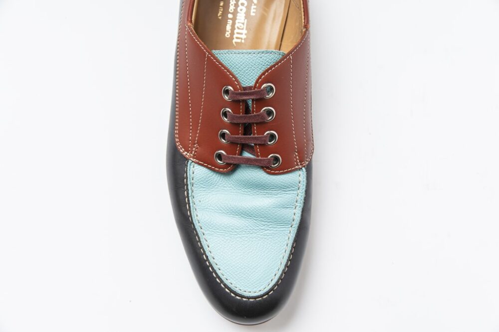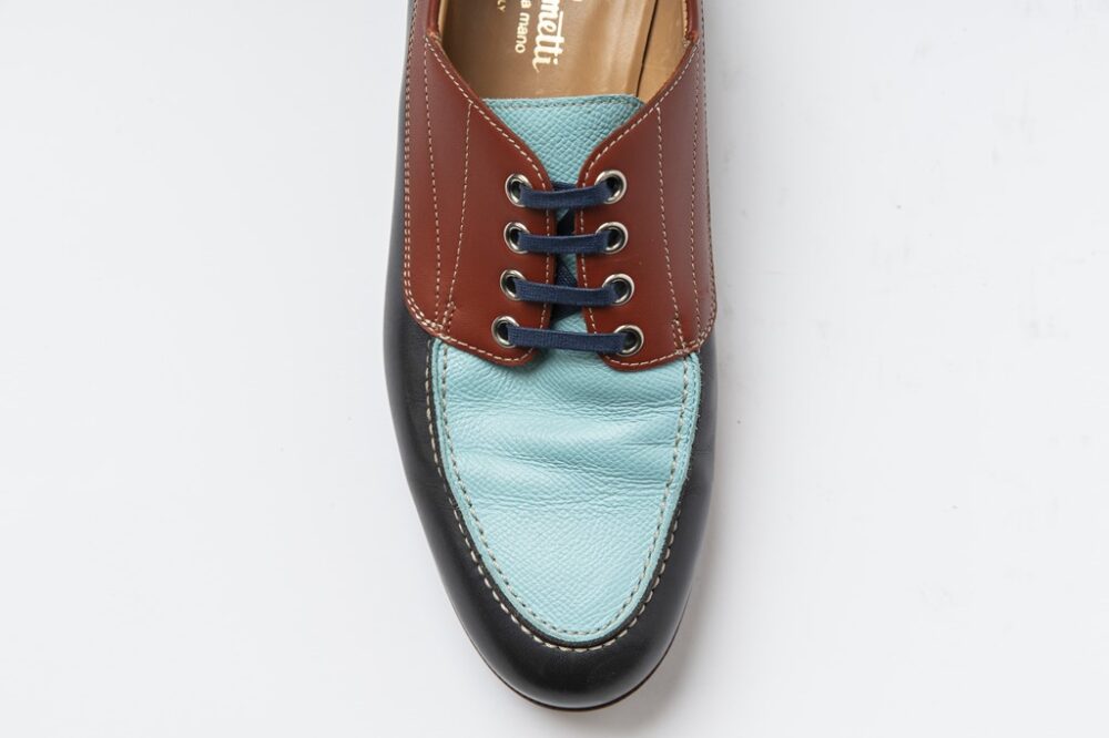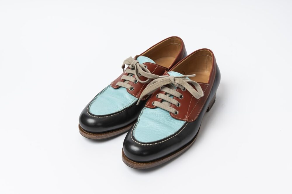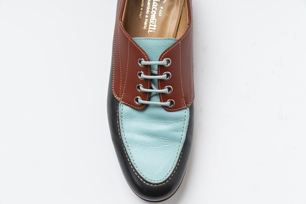 サンカッケーがイタリアのフラテッリジャコメッティに別注したユニークなカラーブロックのモックトゥシューズ。付