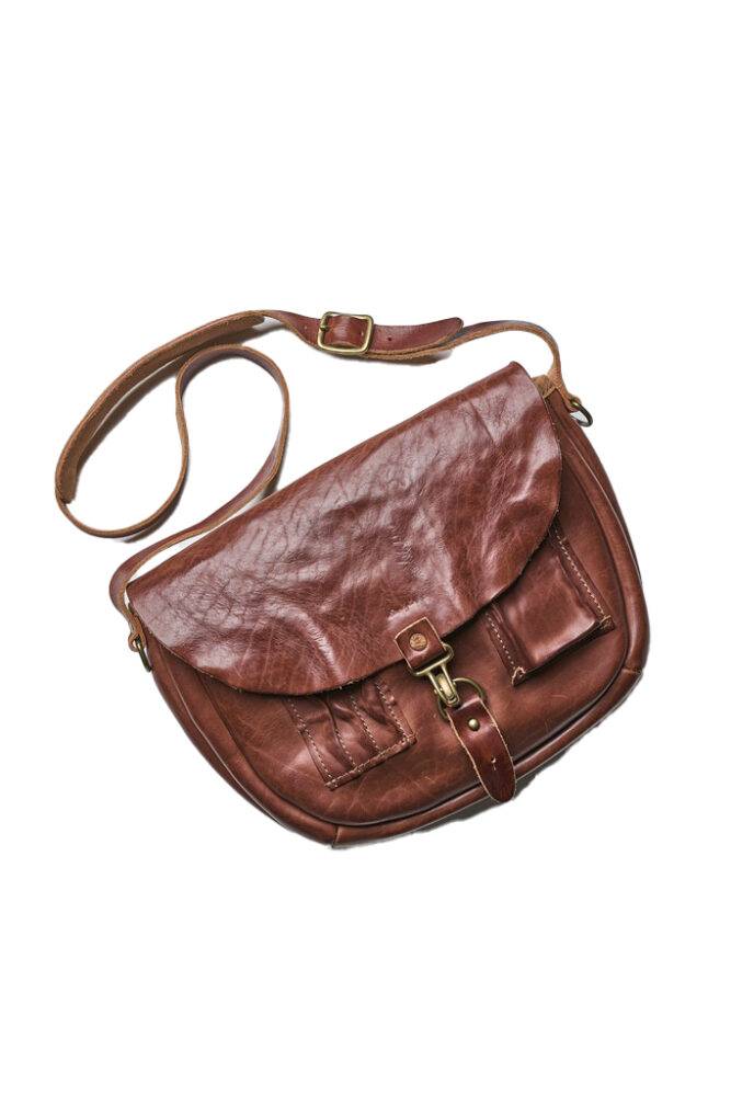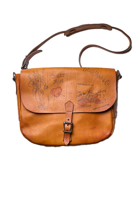 前後パネルに配されたオリジナルグラフィックが唯一無二な、分厚いカウレザーを使用したショルダーバッグ。ストラップは着脱式。背面にハンドル付きで、手提げバッグとしても使用可能。(グラッドハンド コア TEL03-6438-9499)