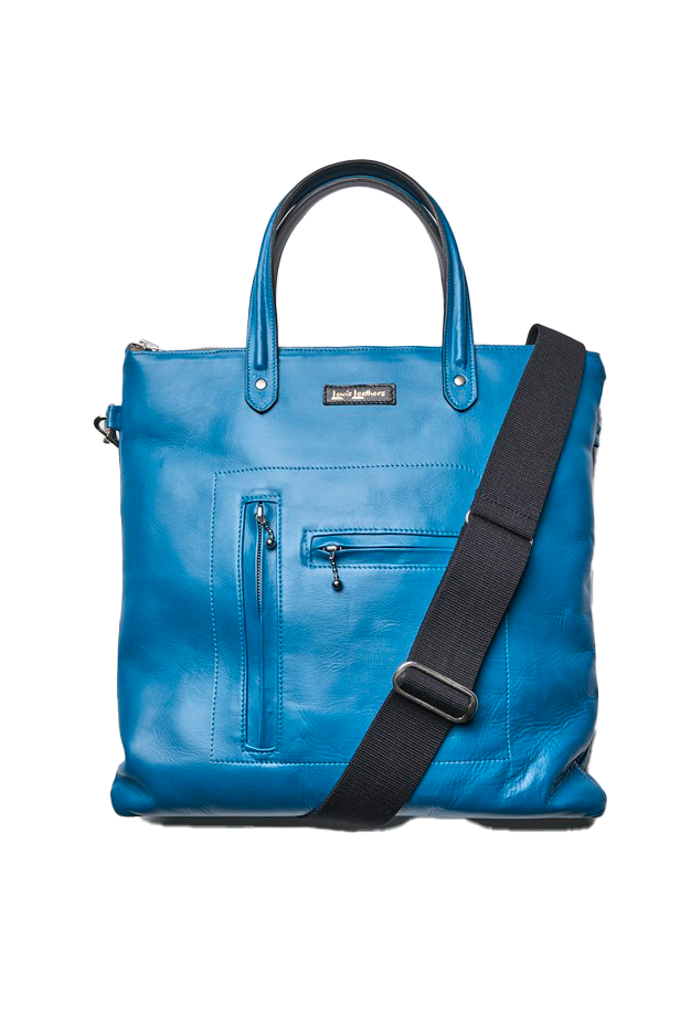 英国式ライダースジャケットの王様が作るショルダー/トートの2WAYバッグ。内部にはノートPCも収納できる大型ポケットあり。鮮やかなターコイズブルーのホースレザーもここならでは。(ルイスレザーズジャパン TEL03-6438-9215)