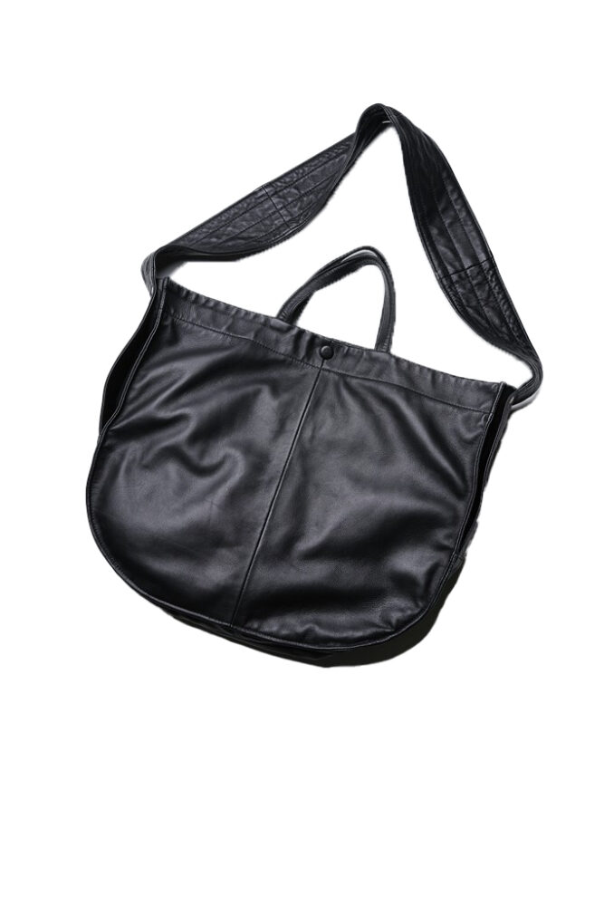 ボディから付属パーツまで、すべてをブラックで統一したソリッドカラーリングのニュースペーパーバッグ。ボディには、柔軟性の高いシープスキンを採用。アジャスタを省略したストラップも潔し。(イーライト TEL03-6712-7034)