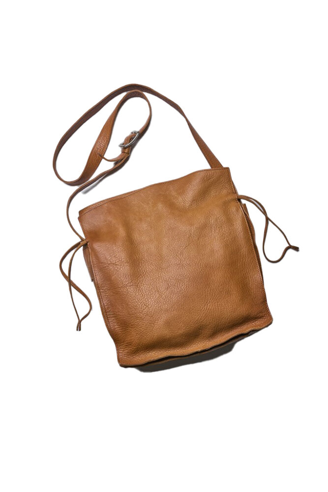 シンプルなスクエア型のドローストリング式ショルダーバッグ。ソフトな質感の中にも確かなコシを備えるベジタブルタンニンディアスキンは、一度使えば病みつき確実。内部に仕切あり。(SLOW自由が丘店 TEL03-5731-3374)