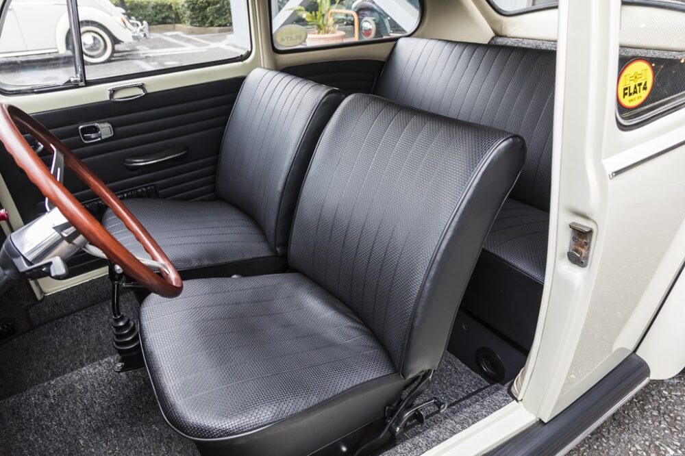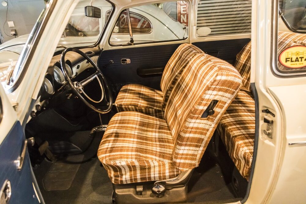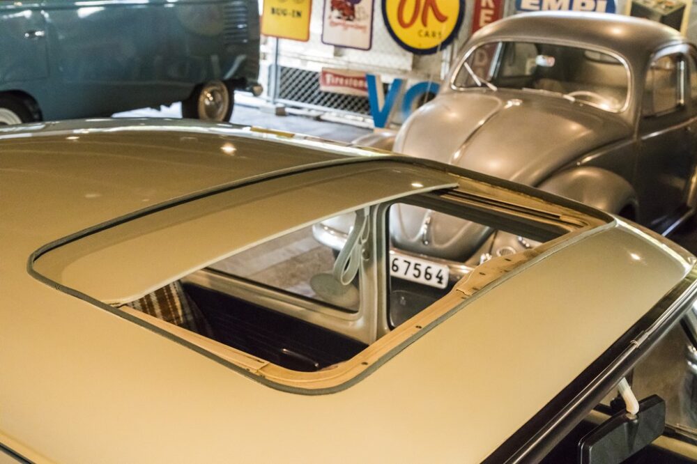 内装もシートカバーが備わるが、その下にはオリジナルのブルーファクリックのシートが残る。またオプションのスライディングルーフを装備し、開放感のある車両となっている。