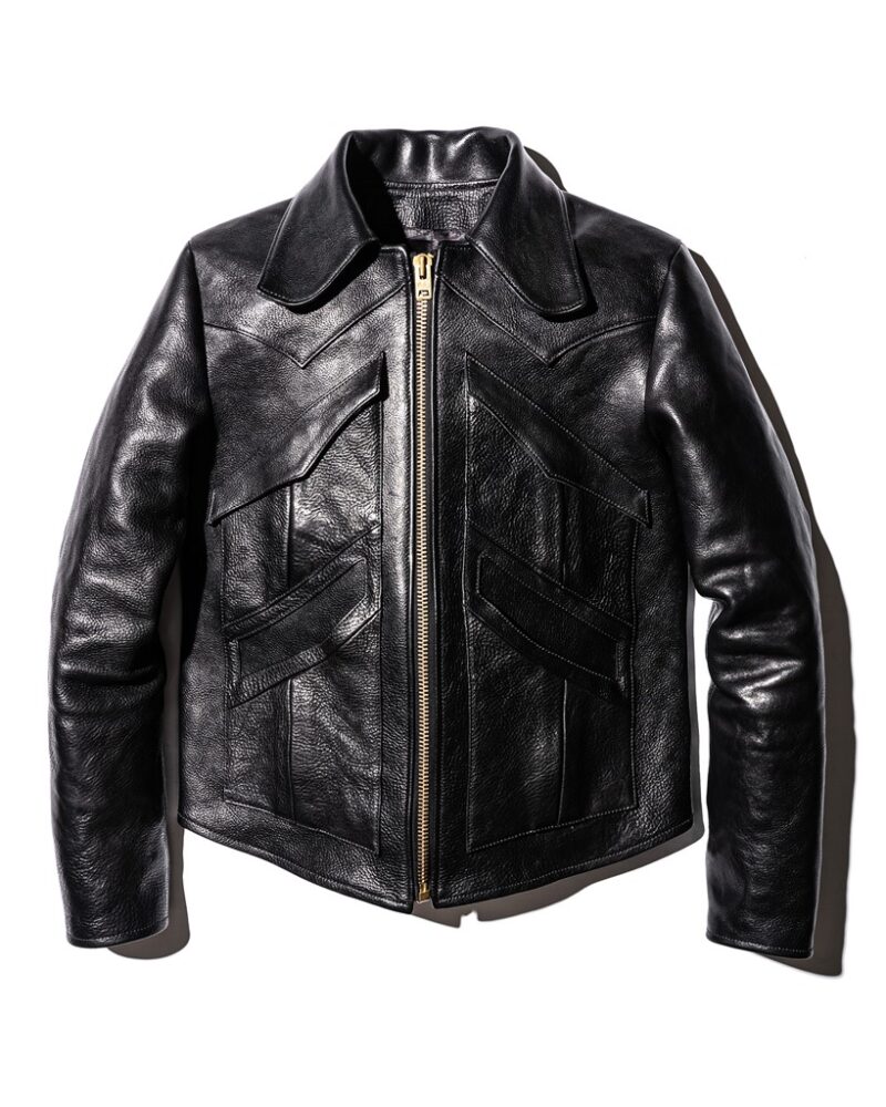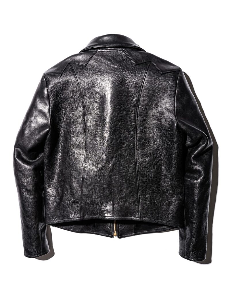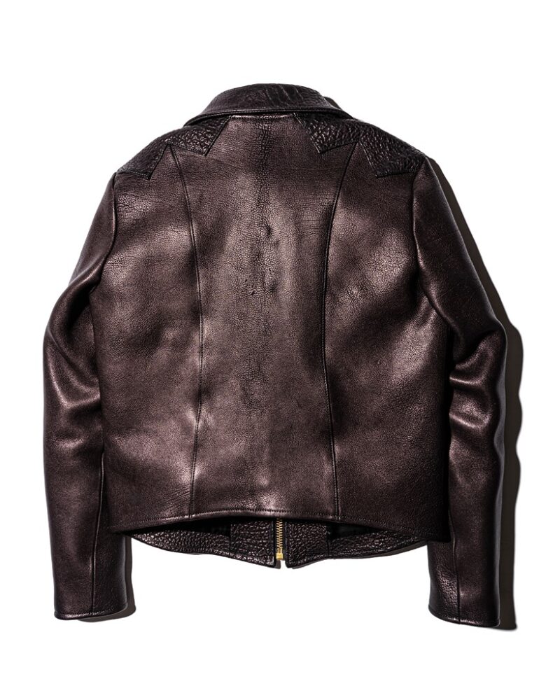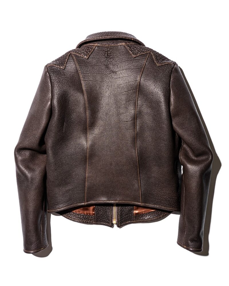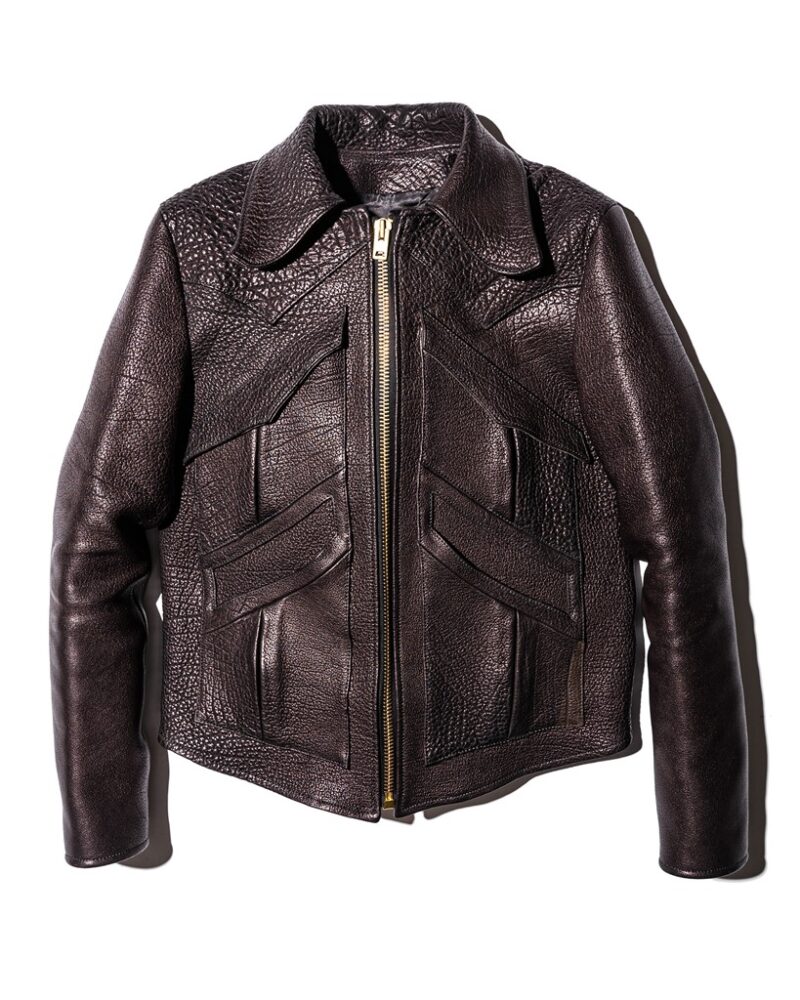 上の写真のカラー違いのモデルで、こちらは赤みがかったブラック仕様。シボ感の強い渋鞣しのバッファローハイドを一頭使いしており、革の背骨部分がジャケットの背中心に来るよう配されている。オリジナルの持つタイトシルエットはそのままに、通常体型の人でもスムースに着られるよう、パターンが改良されている。22万9900円