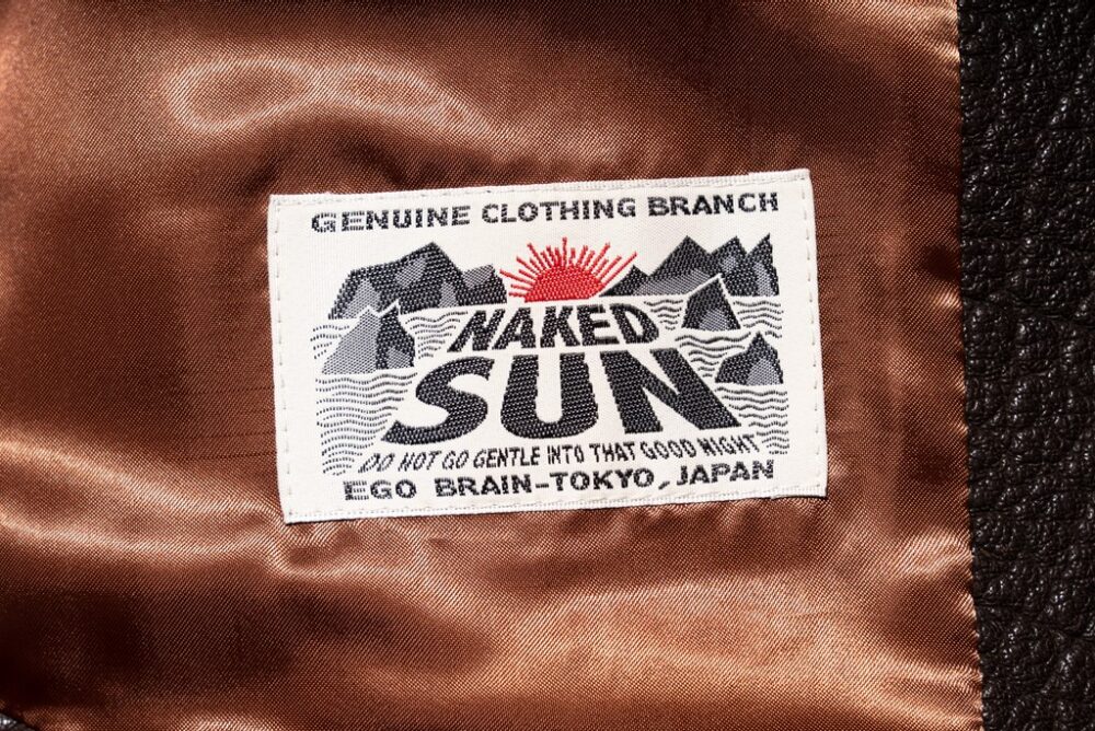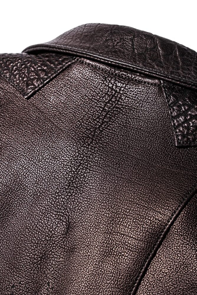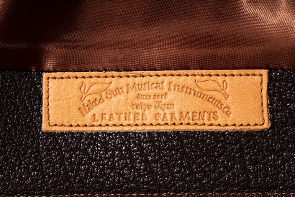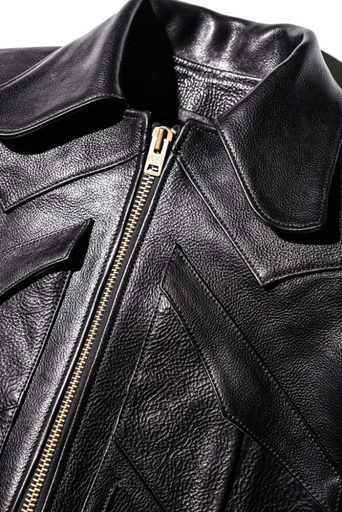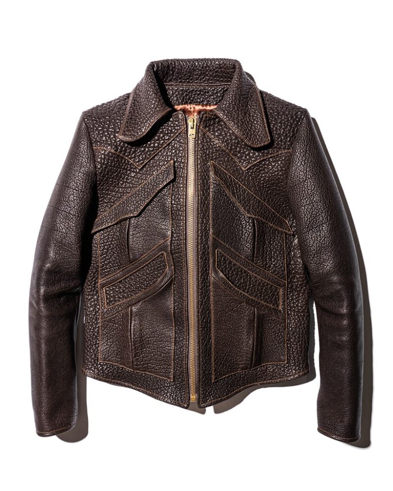 上の写真のカラー違いのモデルで、こちらは赤みがかったブラック仕様。シボ感の強い渋鞣しのバッファローハイドを一頭使いしており、革の背骨部分がジャケットの背中心に来るよう配されている。オリジナルの持つタイトシルエットはそのままに、通常体型の人でもスムースに着られるよう、パターンが改良されている。22万9900円