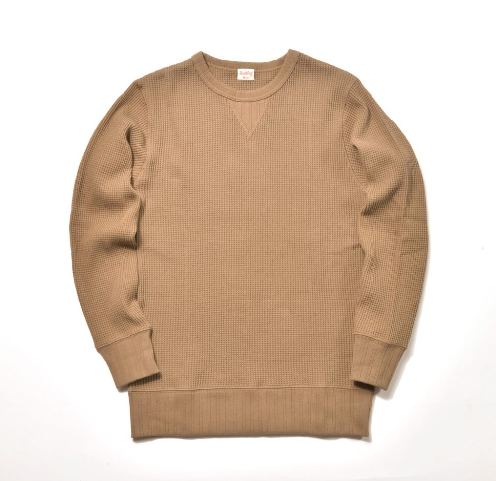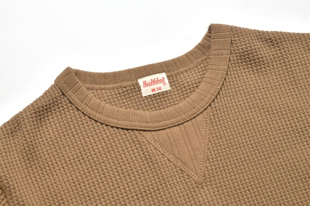 保温性に優れた非常に肉厚な素材は、春先や秋口にはトップスとして、冬場にはインナーとして重宝するヘルスニットの秋冬最定番素材『スーパーヘビーワッフル』を使用。厚手ながらも伸縮性に優れており、ストレスの無い着用感もポイント。前Vや裾口の針抜きフライスなどヴィンテージライクなディティールにも注目。9790円