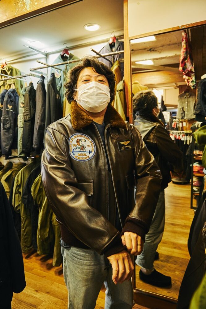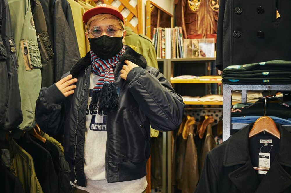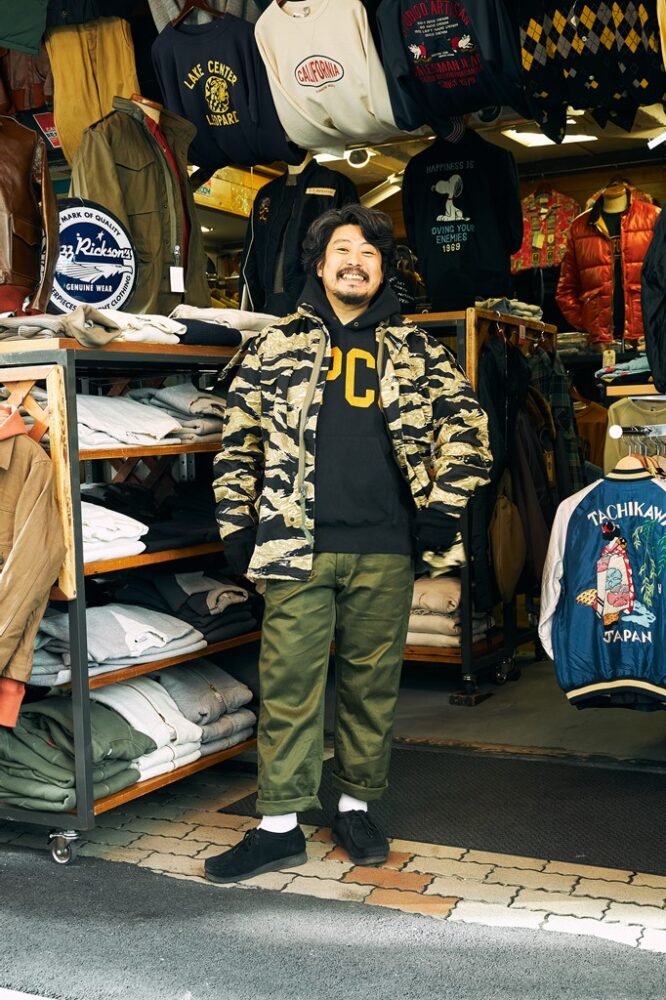 ミリタリースタイルが大好きなADちゃん。品揃え豊富なフライトジャケットで決めるのかと思いきや、ゴールドタイガーパターンのバズリクソンズM-65(5万7200円)をチョイス。すっきりシルエットのチノトラウザーズ、バーガスプラスLot.401Zで色合わせもばっちり。バーガスプラスのブラックパーカと私物のスニーカーも色が合ってる!