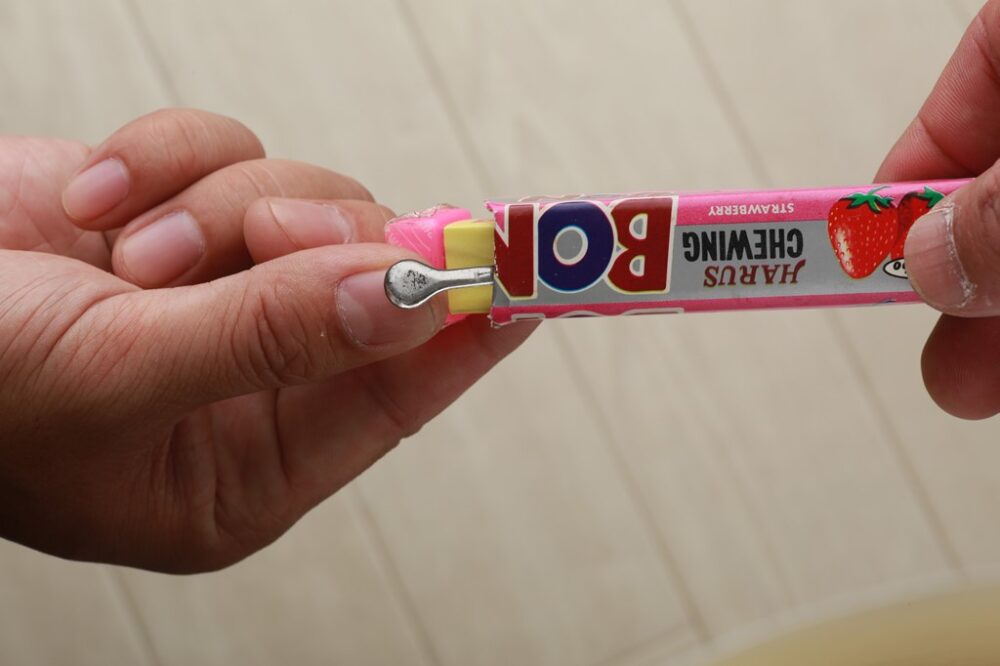 一枚だけ出ているガムを引くと、奥の金具でパチン! 爪の白い部分に当たると激痛が走る。何度も引っ掛かった。