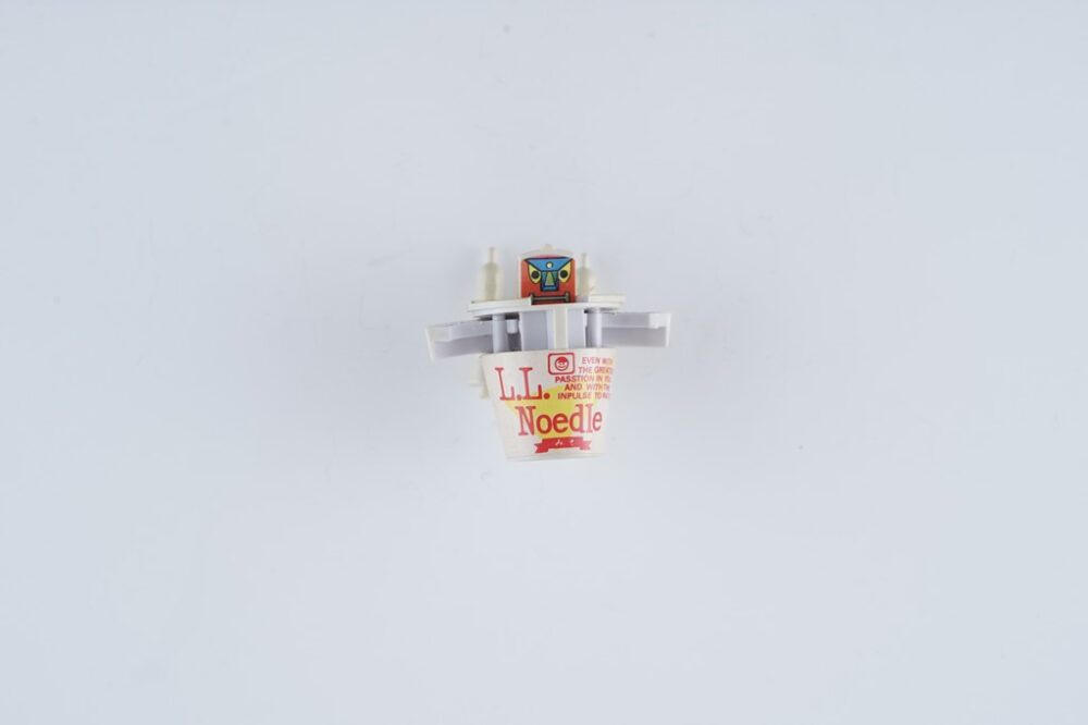 カップめんが変形ロボットに変形。手や足など出した後、最後にフタから顔がひょっこり。なんとも愛敬がある。