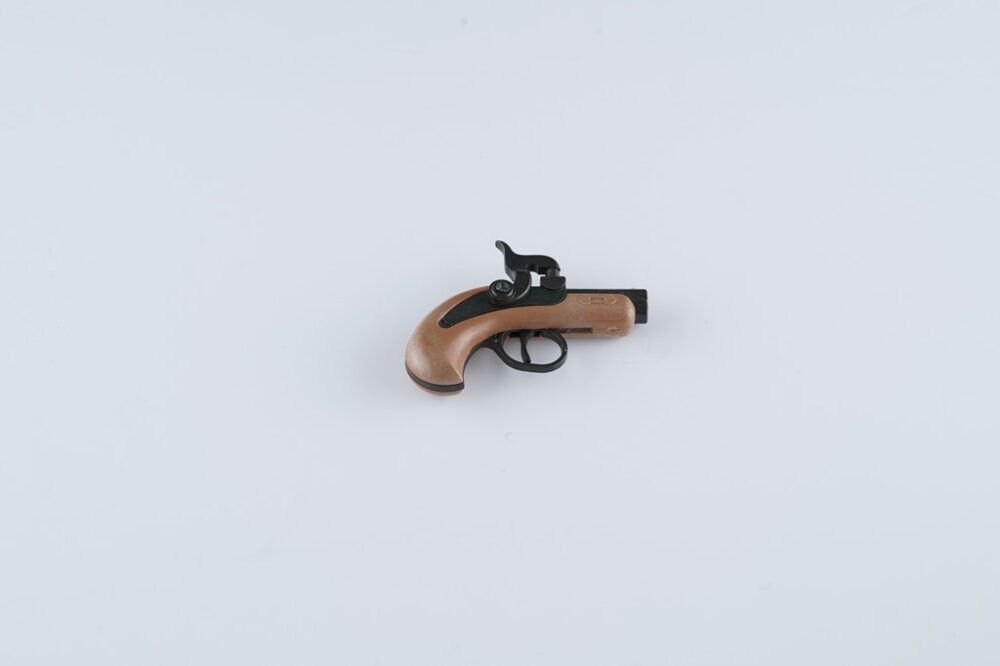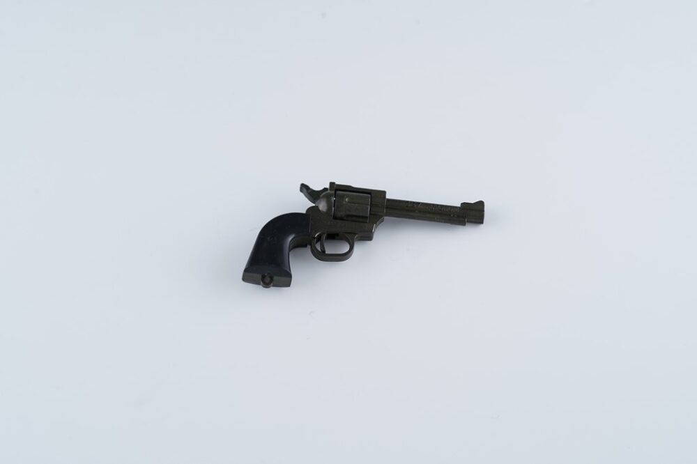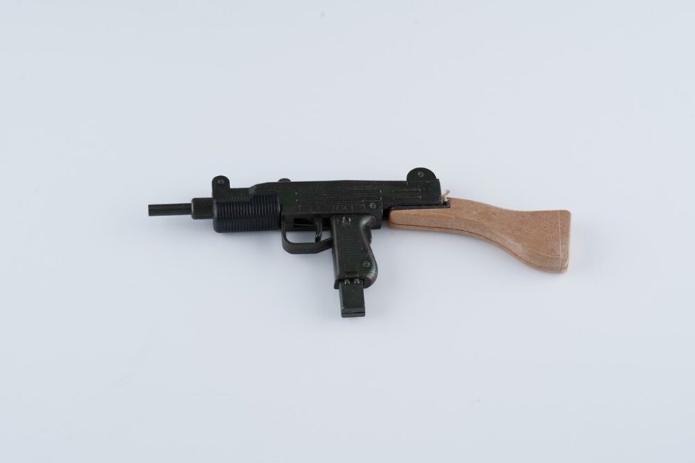 あらゆる銃がダイキャスト製で作られた。上からウージー、火縄銃、S&W44マグナム。火薬で音が鳴る仕掛けで、迫力もなかなかのもの。