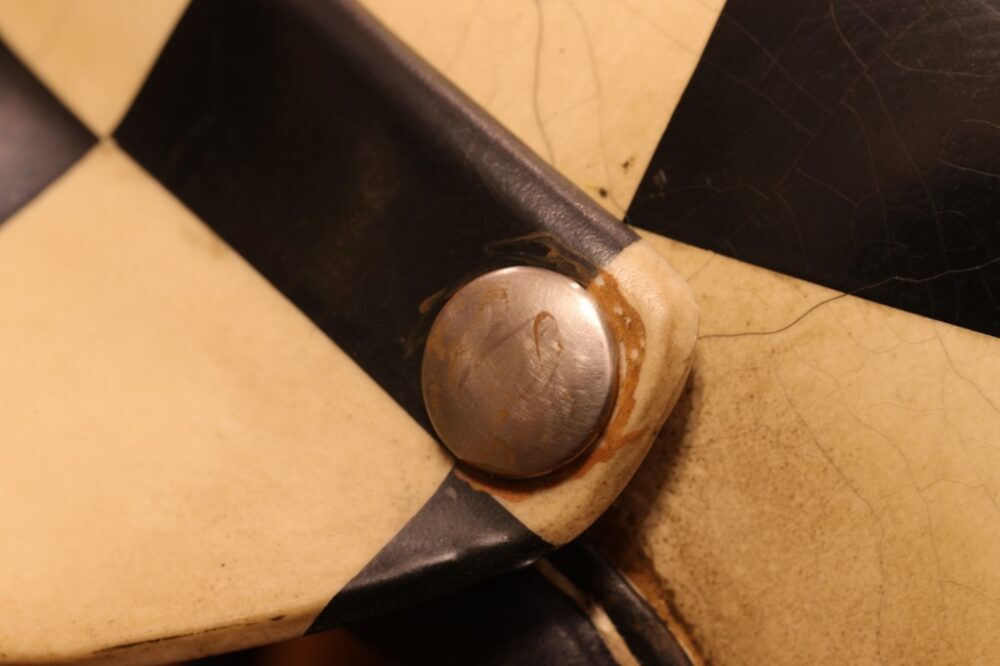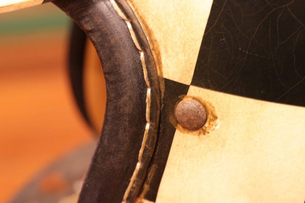 ペイントにエイジング加工を施し、トリムにはクラックが入った特殊な鞣しの牛革を使用。ロウ引きされた麻糸をシェルに貫通させて縫い付けしている。’60年代のヴィンテージモデルをイメージした「革巻き」という独特な膨らみが特徴。