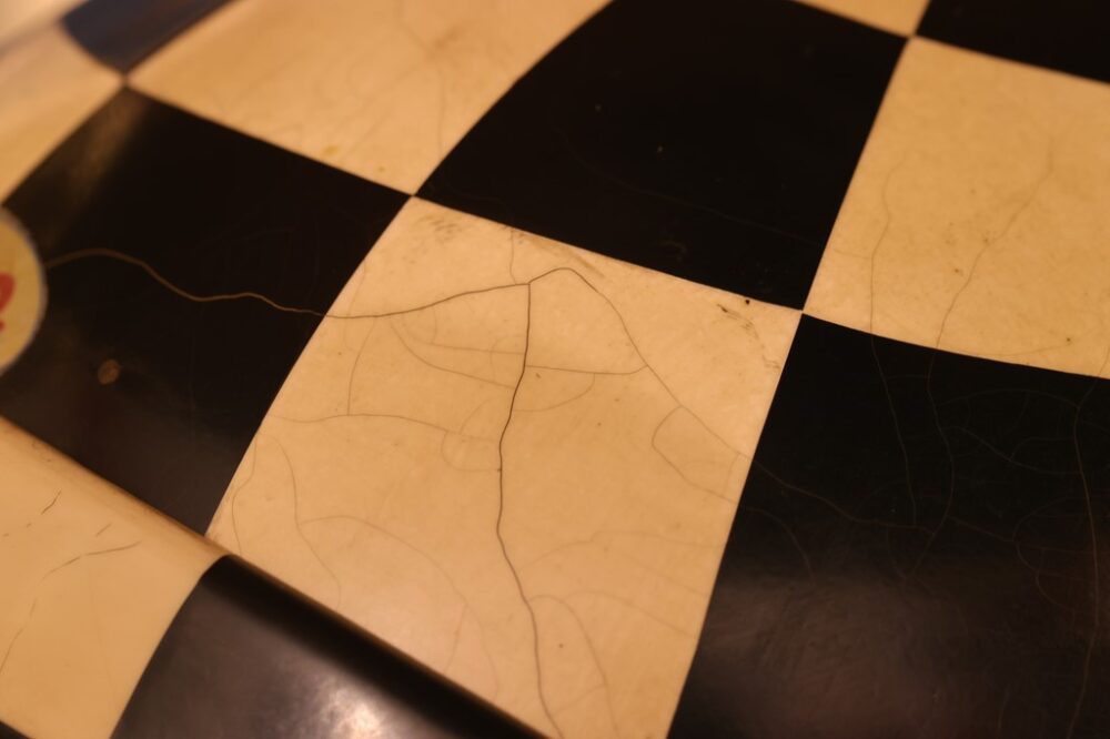 チェッカーフラッグをモチーフにしたグラフィックにエイジングを施した。シェルにダメージを与えず、表面にだけクラックを入れるという独自の技術で、リアルな風合いを再現している。