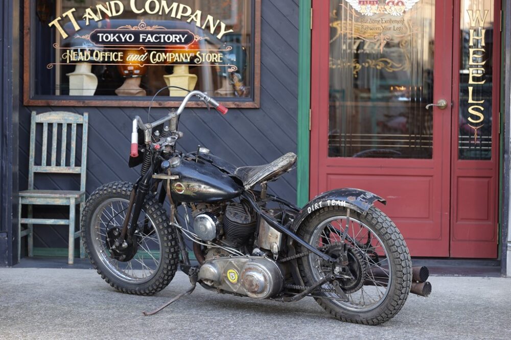 排気量1200ccのサイドバルブエンジンをリジッドフレームとスプリンガーフォークのシャーシに搭載したハーレーの1937年式Uをベースに、「TT&CO.」の代表、高橋さんが、ヴィンテージモトクロスレースに参戦するために製作したダートレーサー。