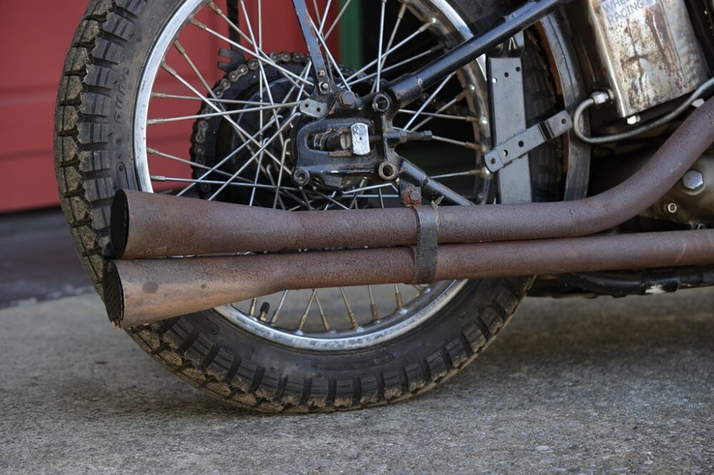 左側2本出しのメガホンマフラーは当時モノのヴィンテージ。ブラック塗装の上に浮き出たリアルなサビが、雰囲気を盛り上げている。