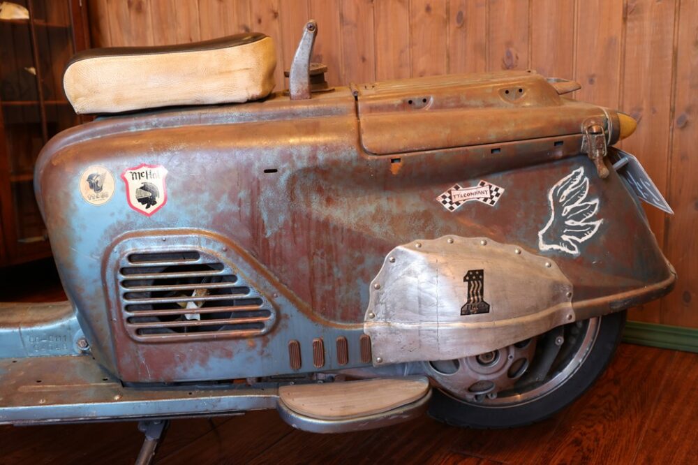 エンジンやシャシーにも手を加えられたマニアックなカスタムだが、質感まで再現されたサビ塗装によるエイジングも魅力。ほどよく色褪せたステッカーやサイドのアルミカバーで、愛らしさにワイルドさを併せ持つスタイルとなっている。